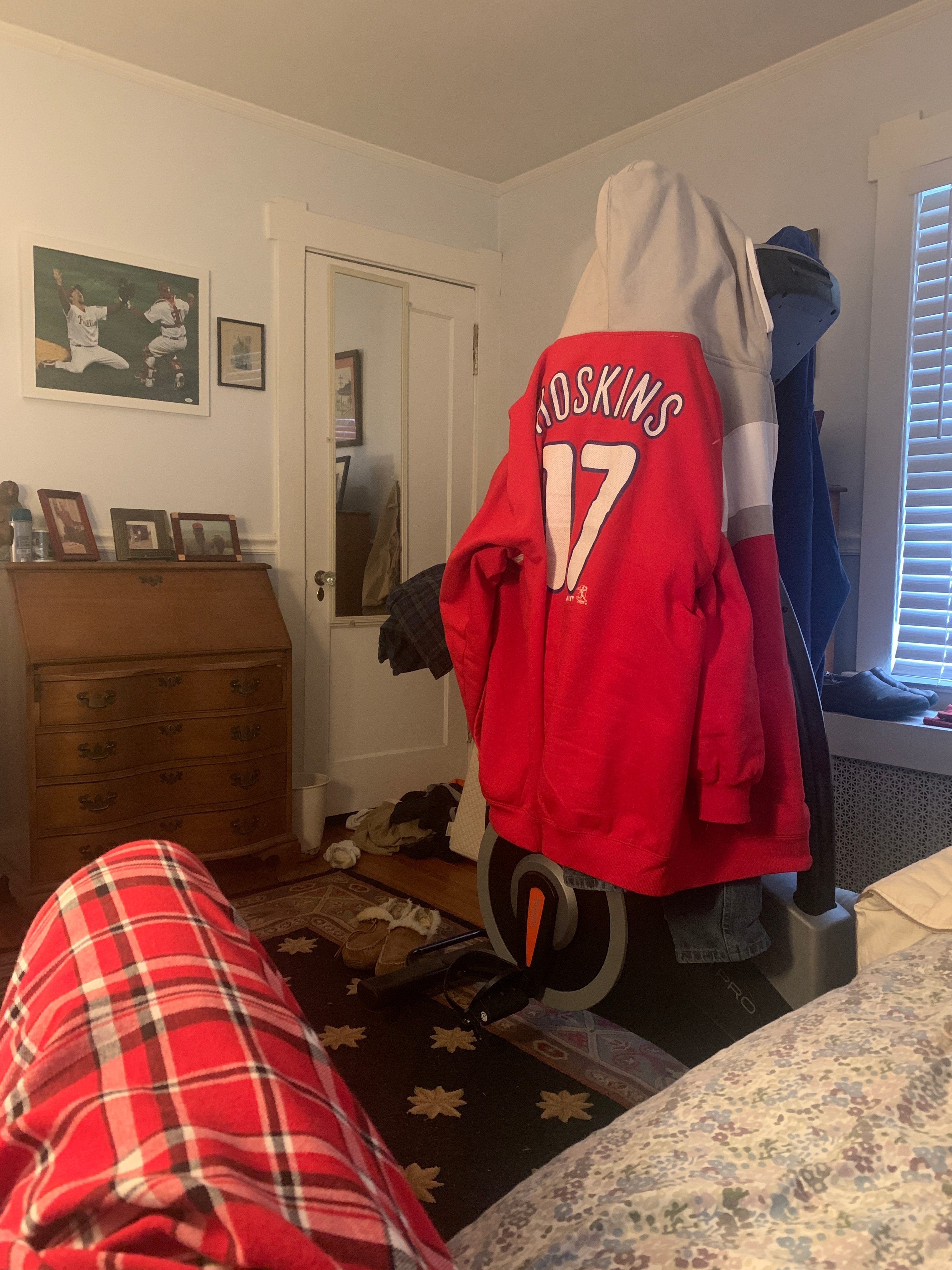 I have no idea, but when I did wake up, the first thing I noticed was a Phillies sweatshirt that Will had given me for Christmas. It was hanging near the bed, the name and number on the back (Hoskins, 17) visible and facing my head on the pillow in the bed. Had this been the last thing I’d seen before going to sleep? I don’t remember. On Christmas morning, when I opened the present, Will was surprised to see the name and number on the back of the sweatshirt. When Will had picked it out and showed it to Sara on the computer before ordering, neither realized that it was a particular player’s sweatshirt. They just liked the design, a zip-up-the-front hoodie in my unusual size, XXL-Tall. Sara was especially concerned on Christmas morning when she saw the name and number because she did not recognize them and worried that they were from a player I did not like--or worse, one who’d been traded from the team. In reality, as in dreams, it’s interesting to wonder why grown men and women wear the named and numbered uniforms of famous athletes, but none of that bothered me. Hoskins is not my favorite player, but I am not worried that people will get the wrong impression of me from my wearing “his” sweatshirt. I just like the fit and style of the sweatshirt.