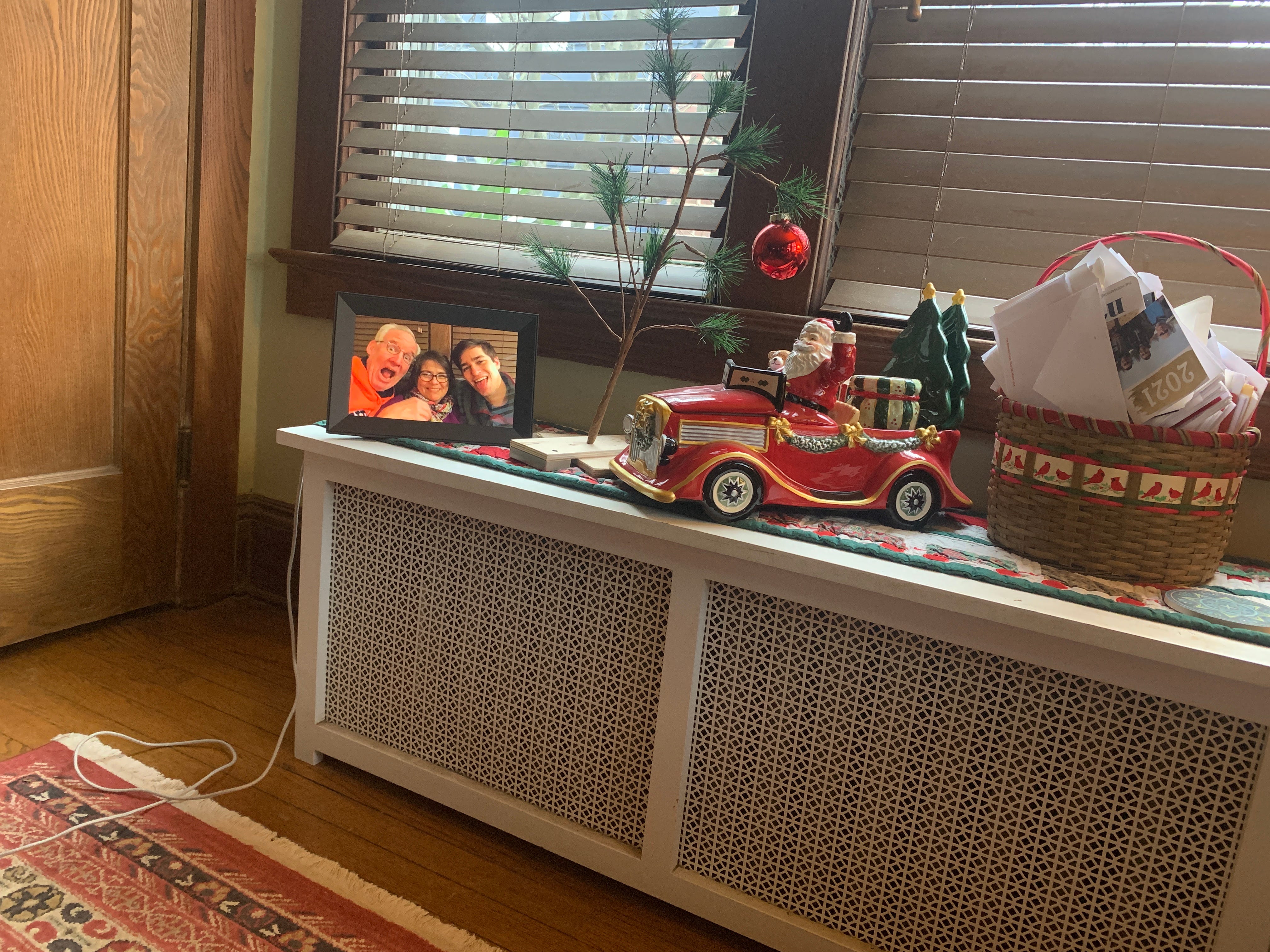 The Aura, set up on our radiator next to the Charlie Brown Christmas tree, a ceramic Santa dish set and our basket for holidays cards and newsletters.