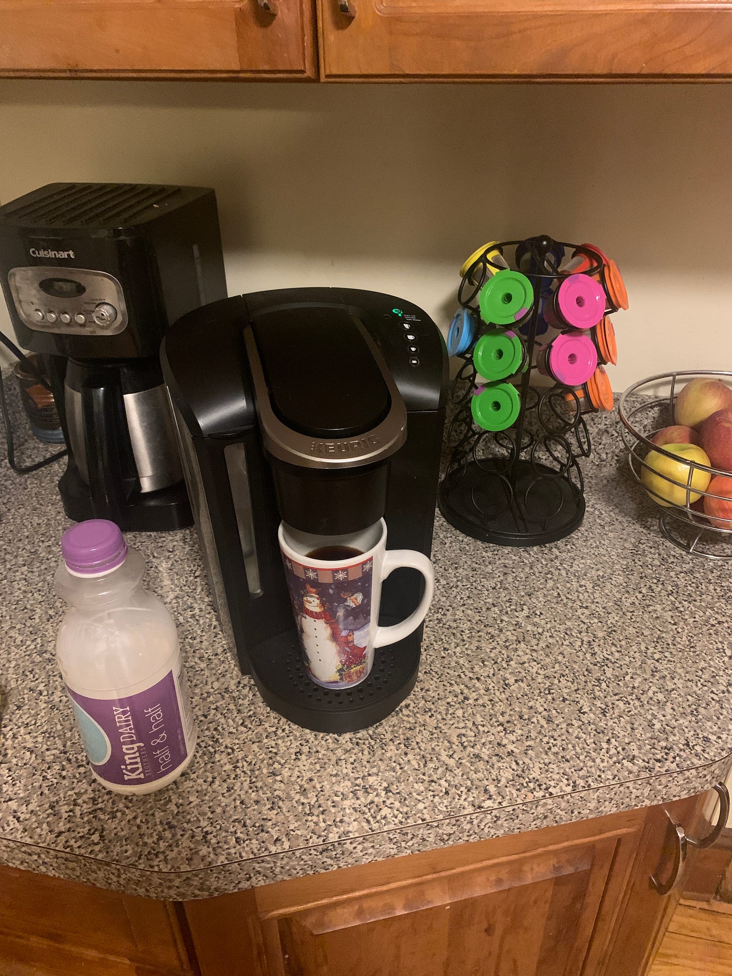 At the start of the pandemic, we bought reusable, colored coffee pods. While I walk the dogs at night, Sara washes the dishes which includes the day’s coffee pods. She leaves them in a drying rack overnight and when I wake up in the morning, I load them into the pod holder next to the Keurig, by color of course.