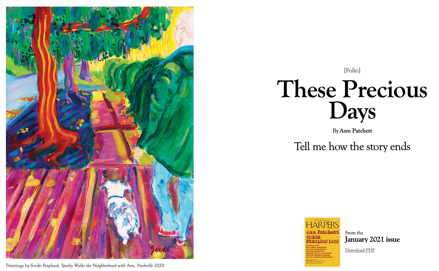 On Thursday, January 7, 2021, I needed a break from work and the madness of the world. I began reading the essay, “These Precious Days” from author Ann Patchett as published in Harper’s. Earlier in the week, I’d seen the vibrant cover painting that Patchett used for the essay pass by on my social media, but I didn’t start reading the essay until Thursday. That’s when I saw it recommended in the weekly newsletter from Tommy Tomlinson. Tomlinson called it “… one of the most beautiful things I’ve read in a long time.” Tomlinson’s right. It’s the perfect antidote to these dire times of human darkness--and yes, incredible stupidity.