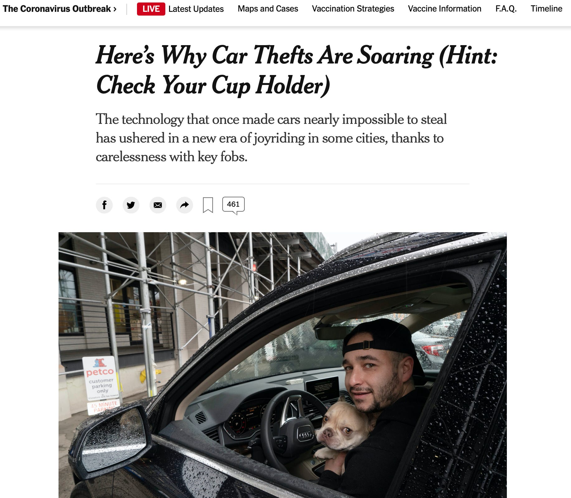 I read the article because I actually thought there was a problem with cup holders which thieves had somehow discovered and were now exploiting. Like most people, Sara and I have cars with cup holders. Were we at risk? According to the article, the number of stolen cars dropped significantly with the invention of key fobs which made it impossible for thieves to break through a car’s technology to start it without a key. No more hot wiring a vehicle. Car thefts dropped by 50% with engines equipped with “immobilizers that only a microchip in the key fob could unlock.” That’s the good news. The bad news is that so many people now leave their key fobs in the cup holder that thieves don’t have to do much to steal a car. Check the door handle, if the car’s unlocked and the key’s in the cupholder, the thief just drives away. Sarah Maslin Nir writes: