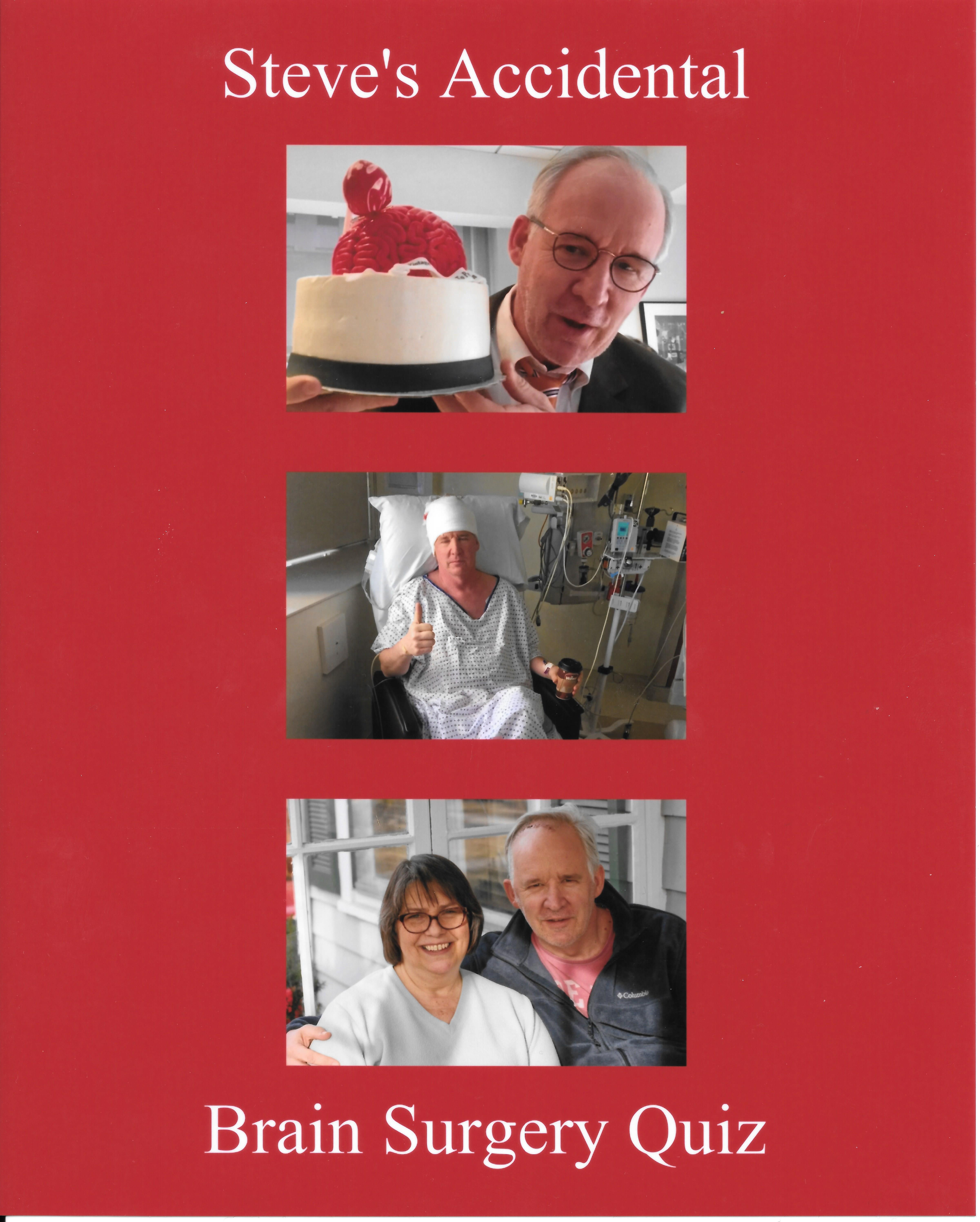 In the surgery, a so-called craniotomy, doctors made a 9.5 inch incision across the top of my scalp, cutting open up a small hole in my skull with saws and drills, clipping the aneurysms, putting the skull back together with a few screws and stapling up the incision. I was out of work for 12 weeks and mid-way through that recovery, I began writing a journal about the whole experience, “Steve’s Accidental Brain Surgery Quiz,” a 101-question “What did not happen?” quiz.