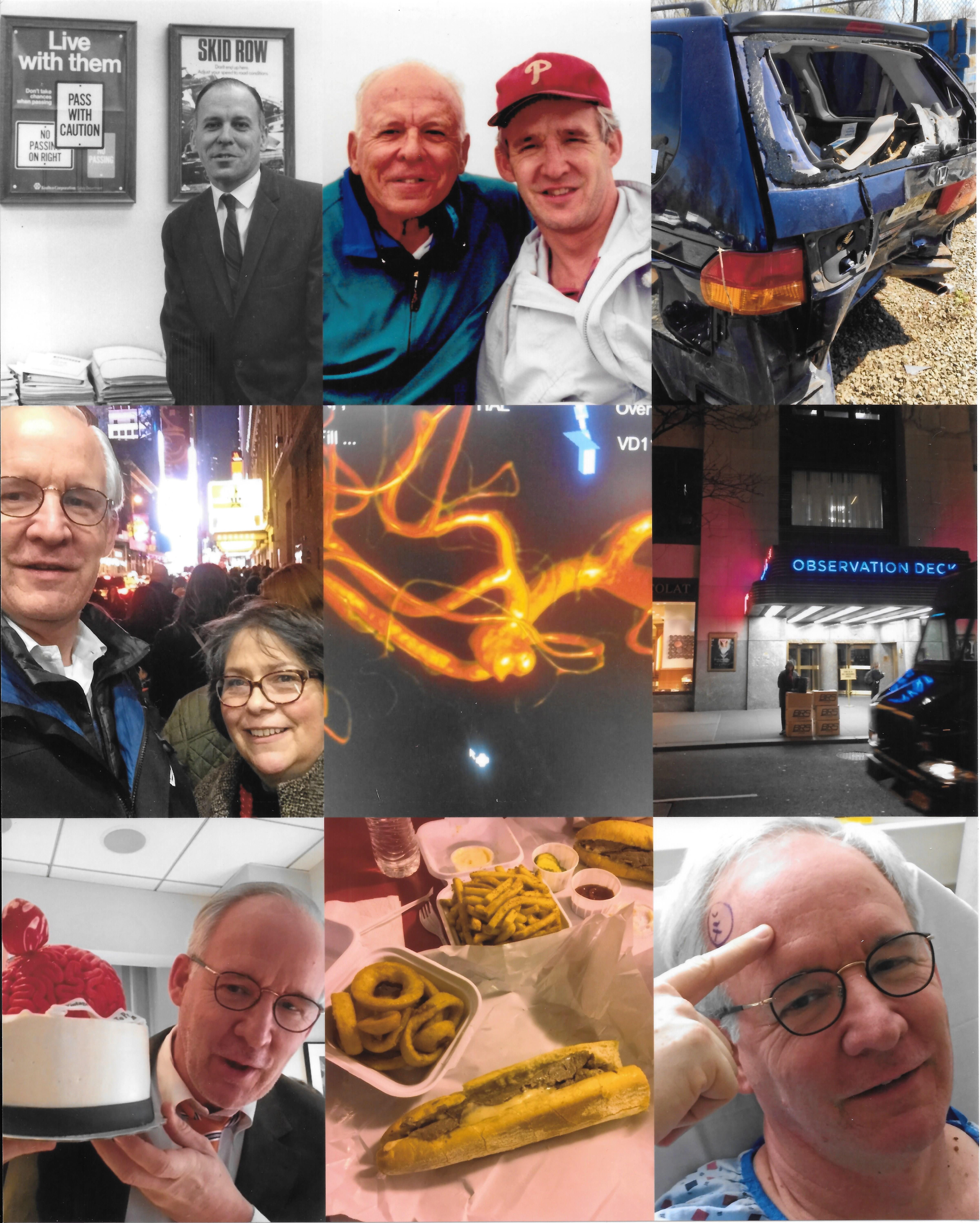A montage from “Steve’s Accidental Brain Surgery Quiz”—and yes, onion rings, fries and a cheesesteak from Tony Luke’s were part of the last meal I chose to have before surgery.